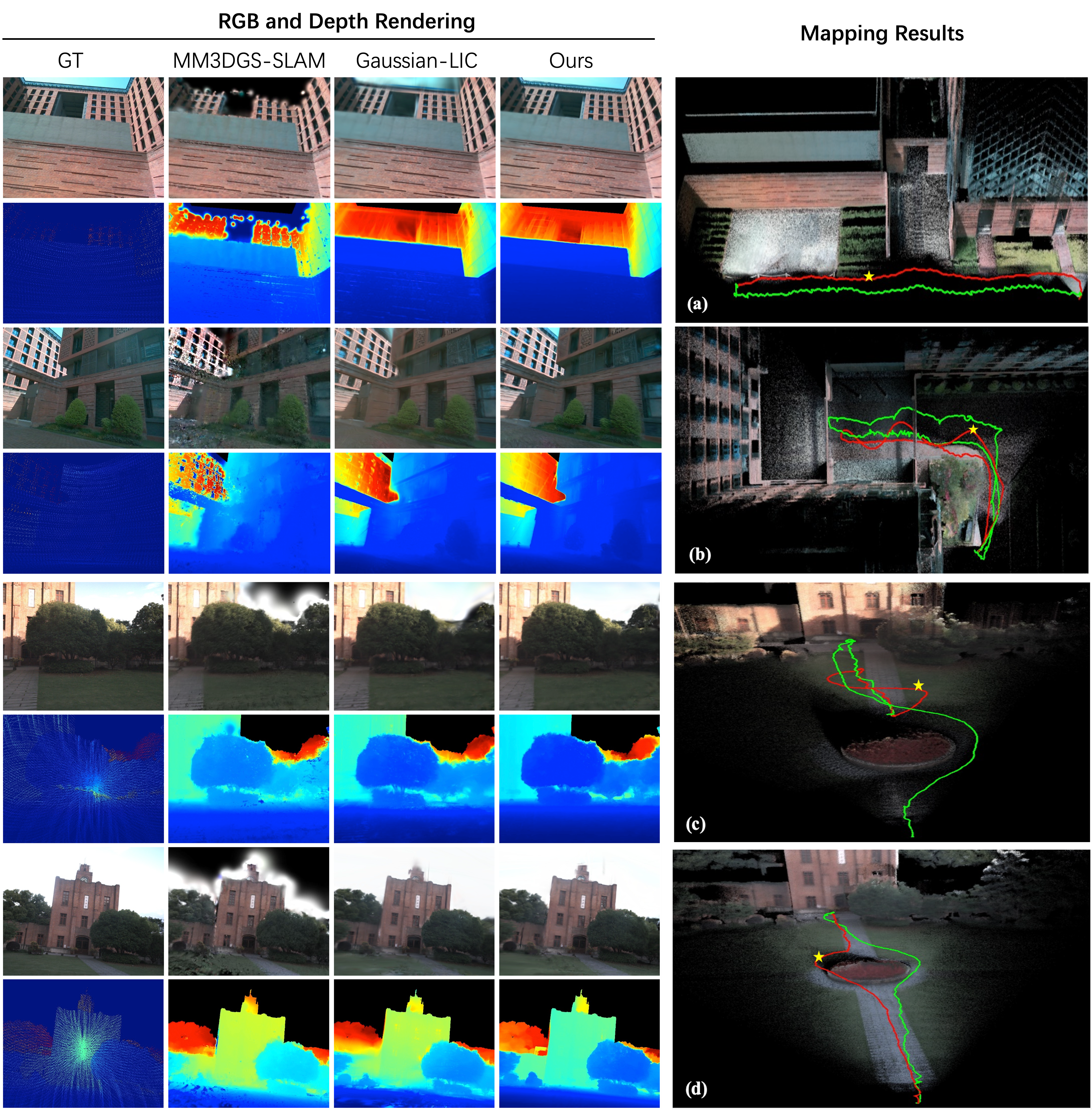 Qualitative results of RGB and depth rendering (out-of-sequence novel view) on our self-collected dataset. (a-d) The green path represents the trajectory for collecting training views, the red path shows the out-of-sequence trajectory for evaluation, and the yellow stars indicate the selected out-of-sequence novel views. The sky regions in rendered depth maps are masked in black.