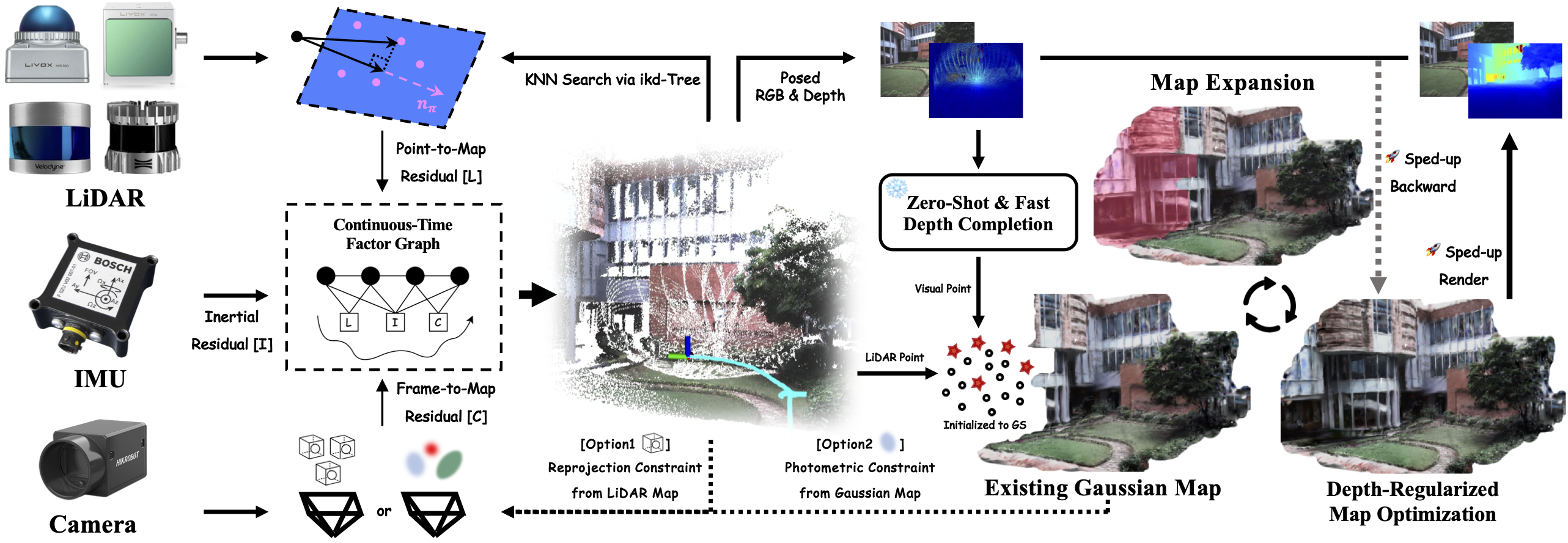 Two main modules: a continuous-time tightly-coupled LiDAR-Inertial-Camera Odometry and an incremental photo-realistic mapping back-end with 3DGS. First, we design a tightly-coupled LiDAR-Inertial-Camera odometry system as the front-end which supports two optional camera factors tightly fused within a continuous-time factor graph, including constraints from the Gaussian map. Second, we utilize an efficient but generalizable depth model to fully initialize Gaussians and prepare mapping data for the back-end. Third, we perform photo-realistic mapping with depth regularization and CUDA-related acceleration.
